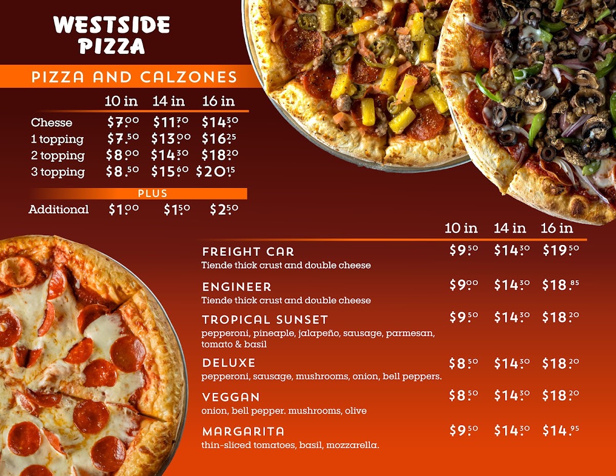 Introducing Westside Pizza Express, a gem nestled in El Paso, TX, where flavor meets affordability. This delightful pizzeria specializes in a diverse menu that caters to every palate. Start your meal with their fresh appetizers, featuring a crisp salad and irresistible breadsticks, perfect for sharing. Their specialty pizzas steal the show, with fan favorites like the hearty Freight Car, classic Margherita, and delightful Tropical Sunset, crafted with quality toppings on a fluffy crust. For veggie lovers, the Veggie pizza offers a burst of garden freshness.